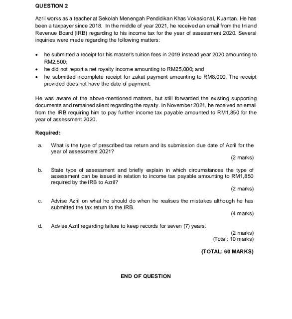 Question 2 Azril Works As A Teacher At Sekolah Chegg Com