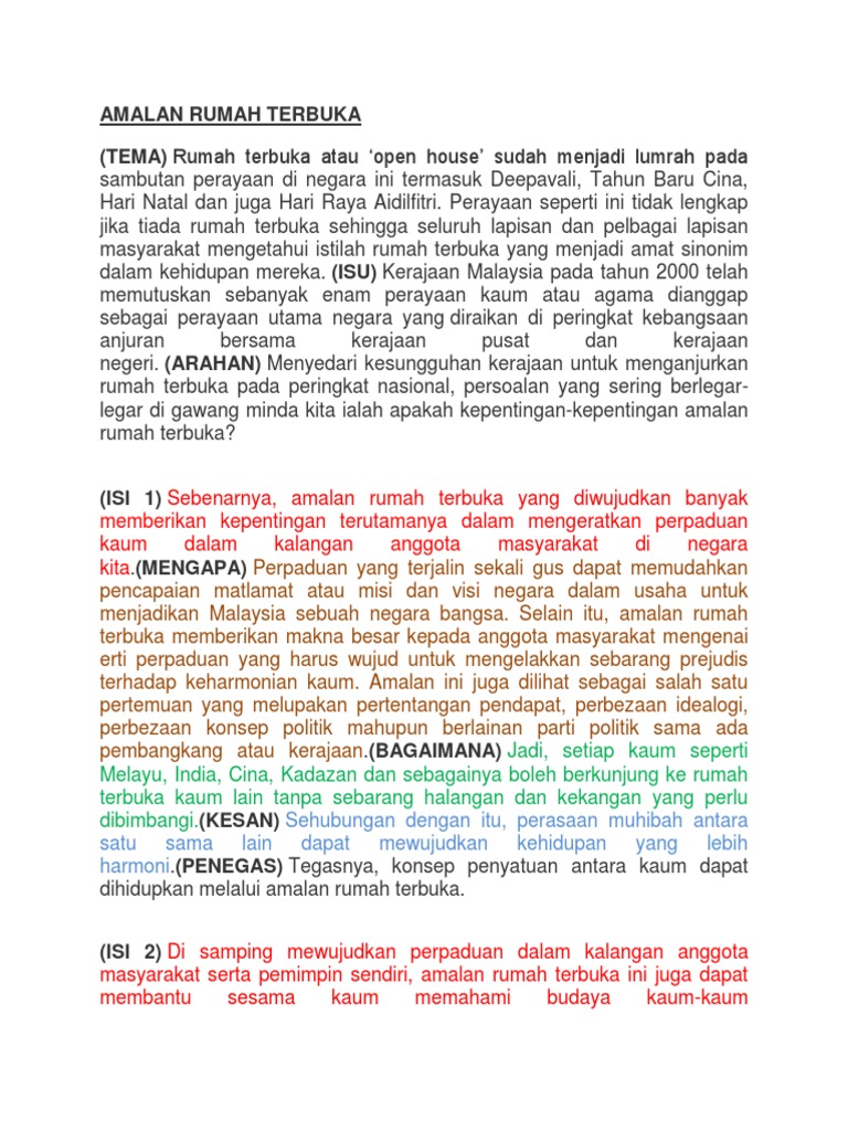 Isi 1 sebenarnya amalan rumah terbuka yang diwujudkan banyak memberikan kepentingan terutamanya. Dengan adanya rumah terbuka mudahlah seseorang itu. Kebelakangan ini amalan mengadakan rumah terbuka menjadi perkara biasa dalam.